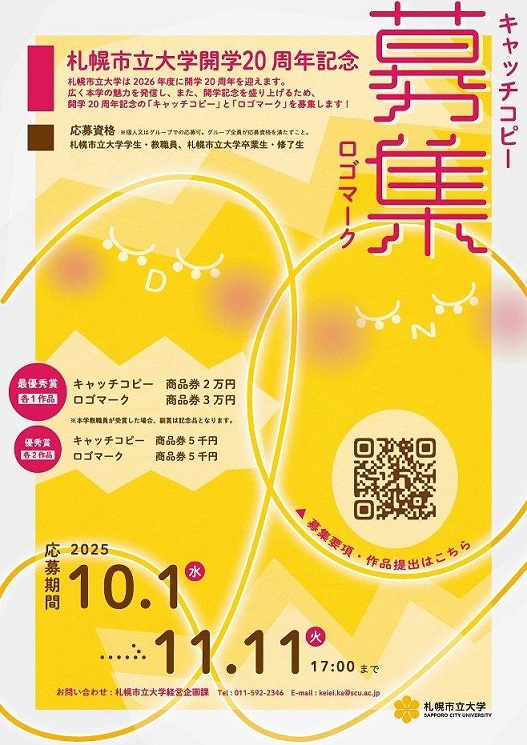 開学20周年記念事業の一環として、広く本学の魅力を発信し、開学20周年を盛り上げるために使用する「キャッチコピー」及び「ロゴマーク」を募集することとなりました。